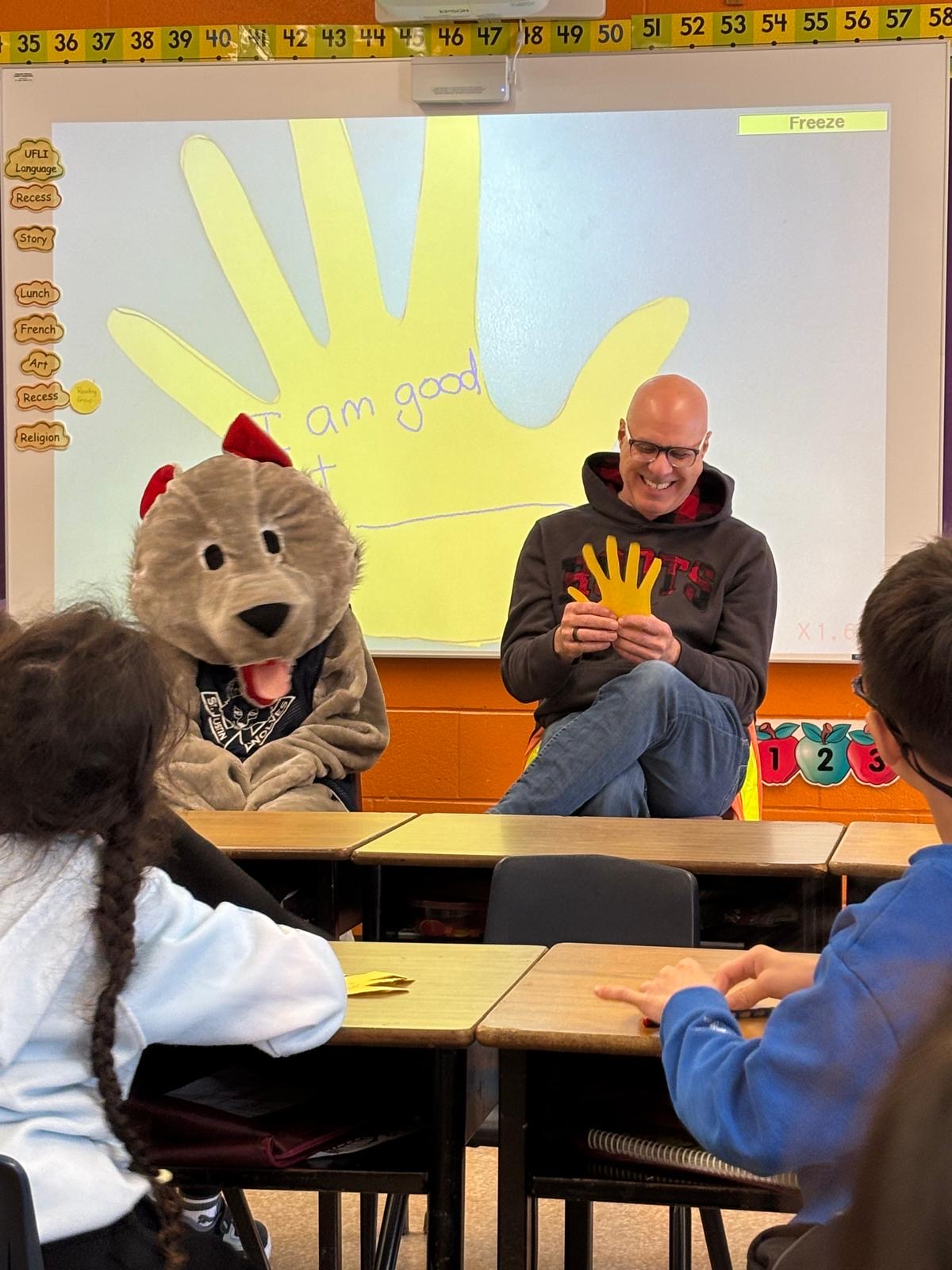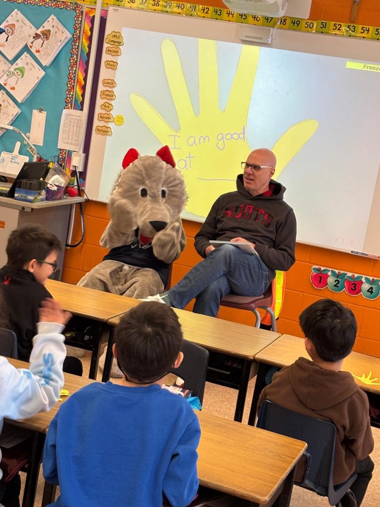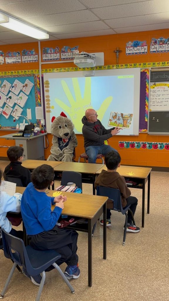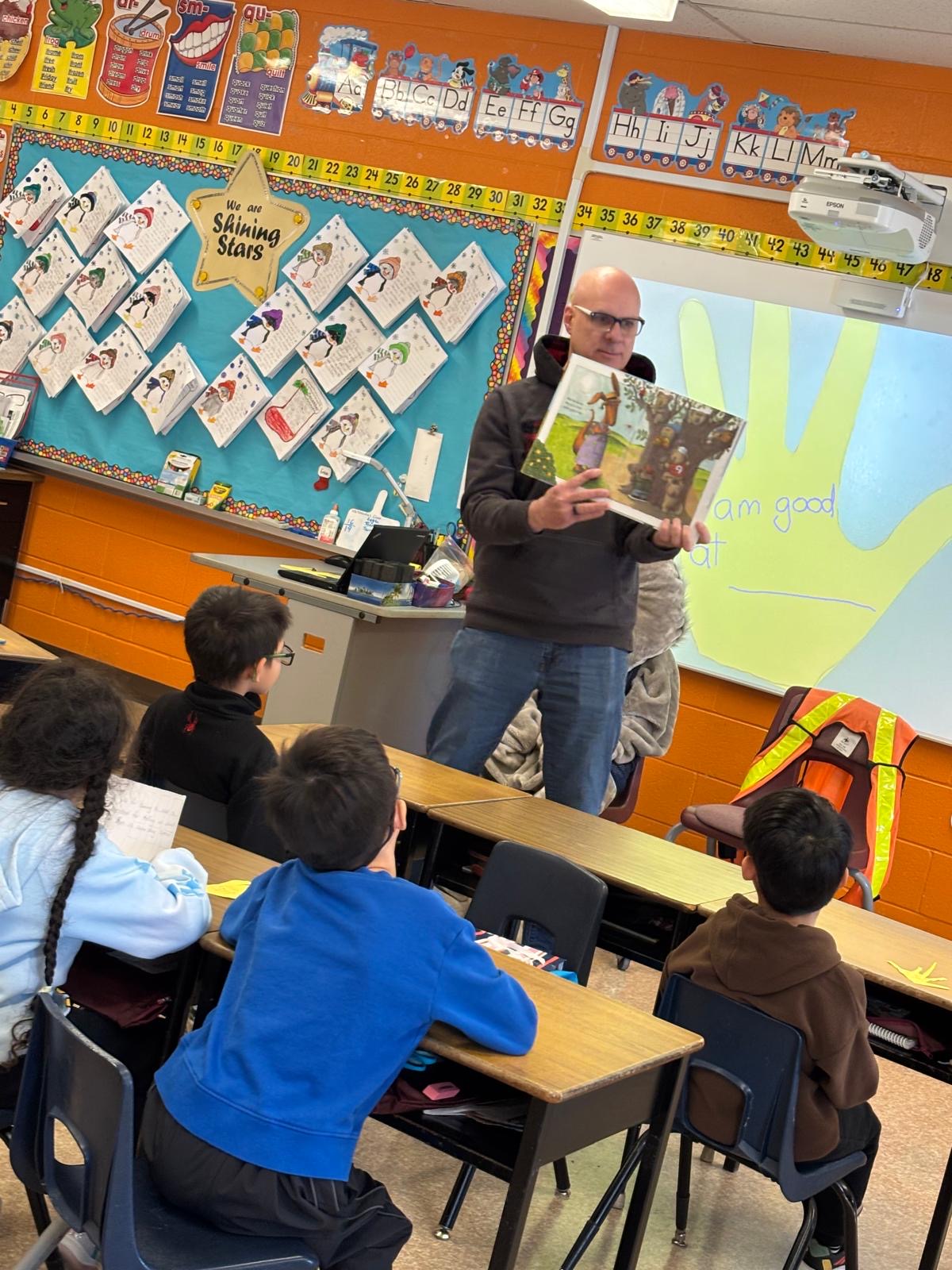 David was there to meet Ms. Noronha’s class, read them a book about virtues and answer their questions. With the next day being Let’s Talk Day, the conversation included some discussion about mental health topics, which David found impressive.