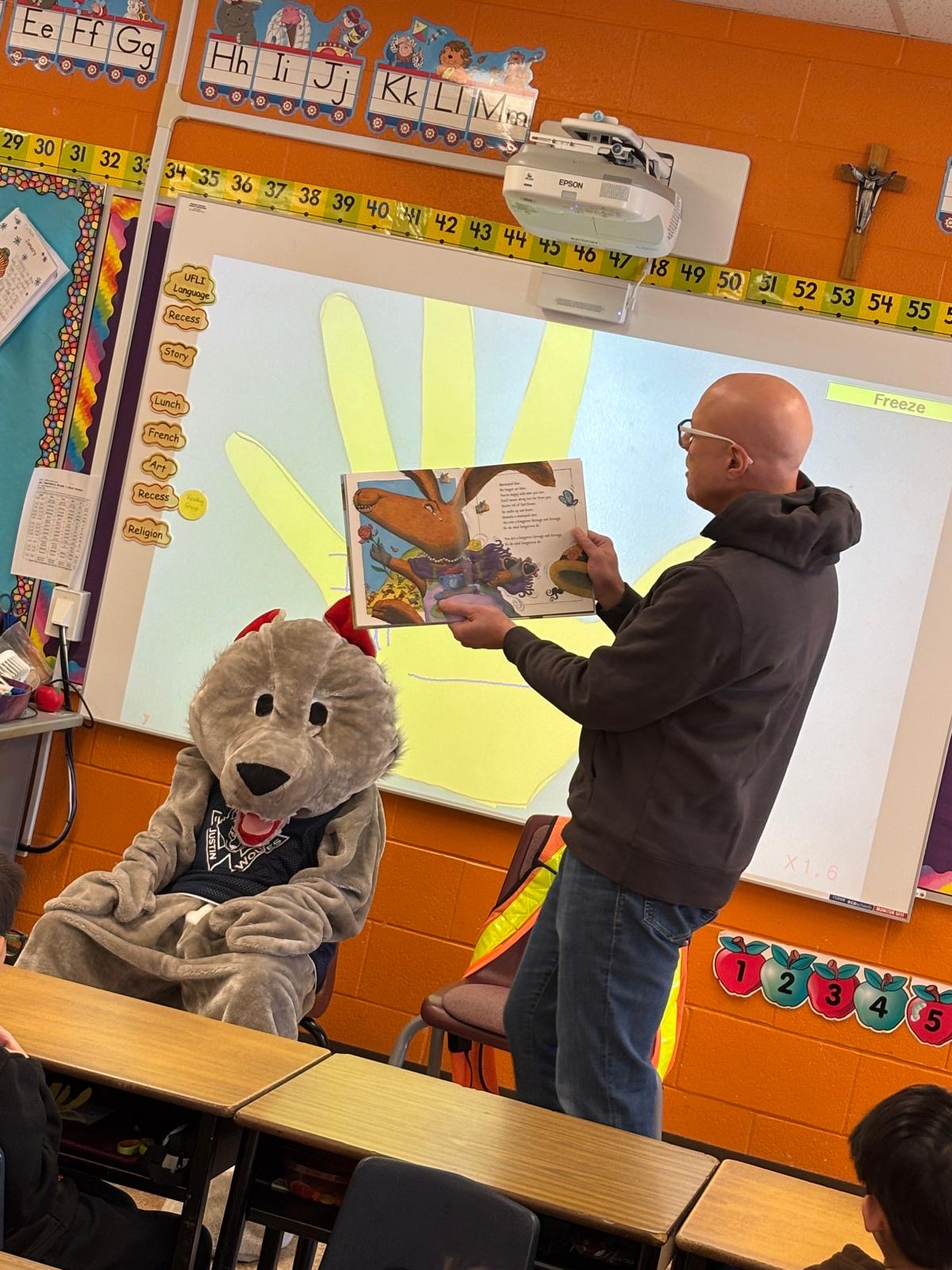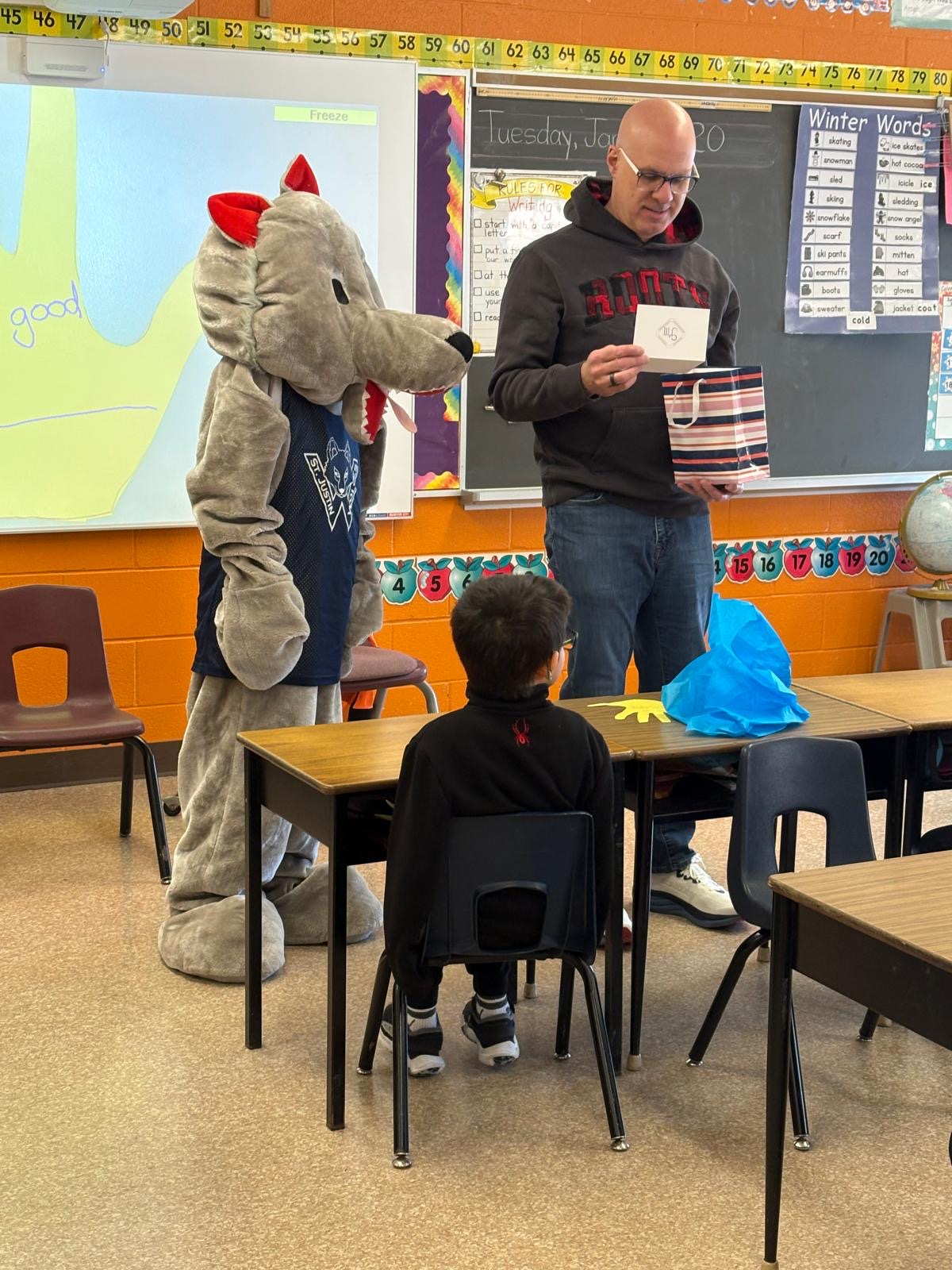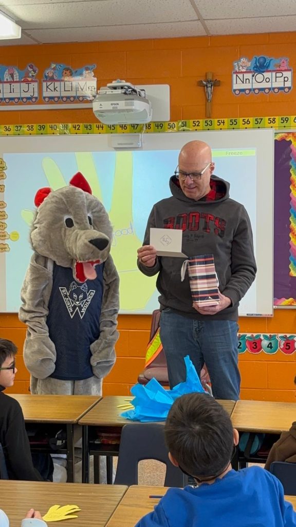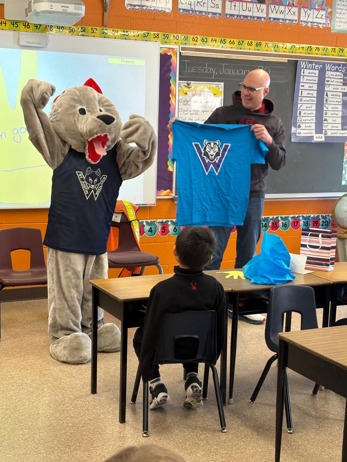 Students were so excited that St. Justin Martyr’s mascot, Wolfie, came out to greet this local celebrity.